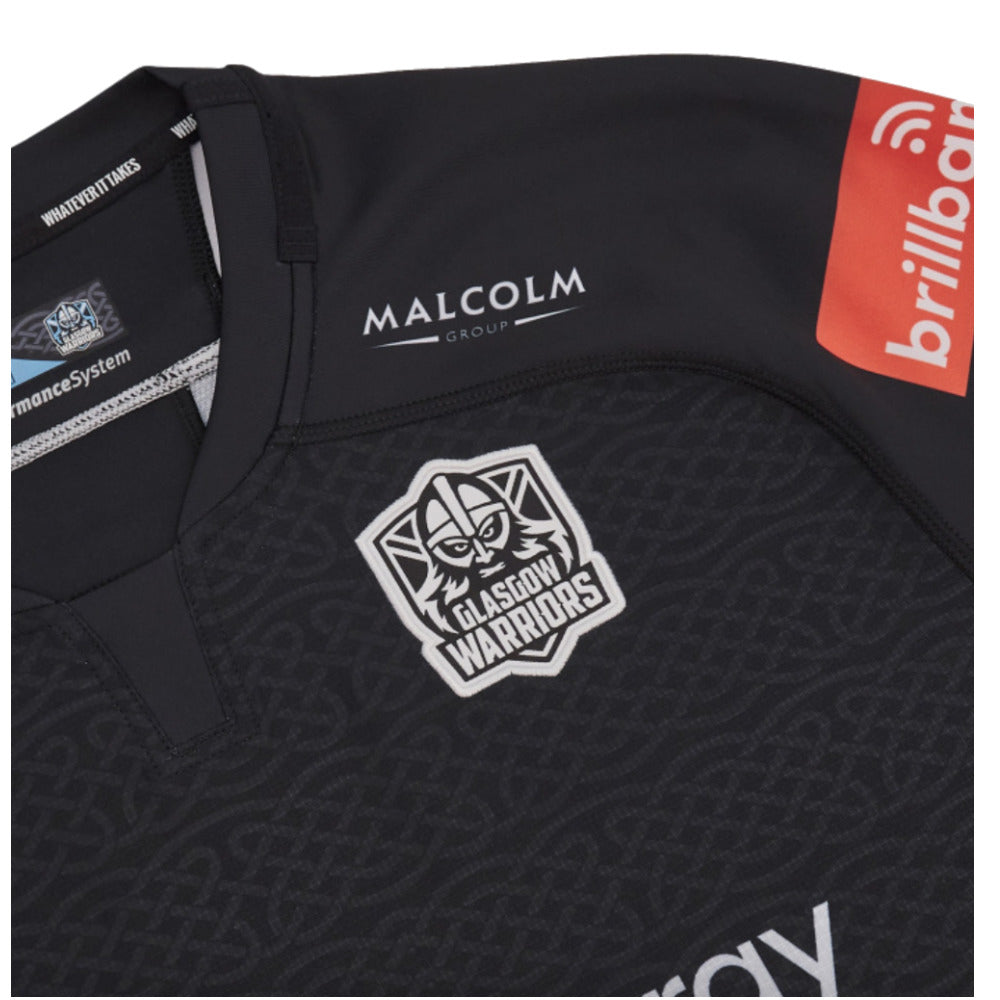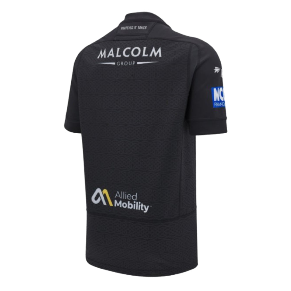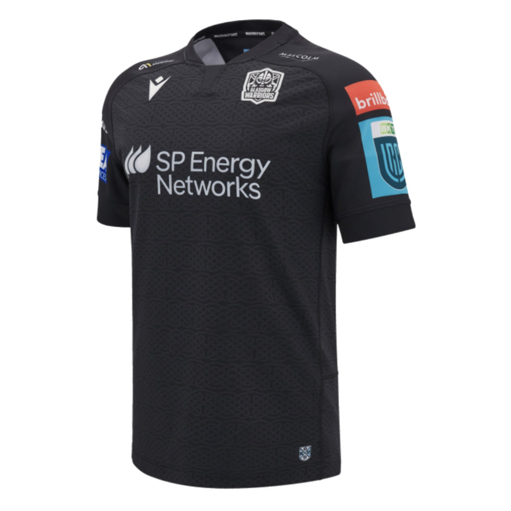 The 2024/25 home match shirt - black slim fit shirt with embossed celtic knot pattern over the body; the Glasgow Warriors crest is applied over the heart in single colour and the GDRU badge is added at the hem.