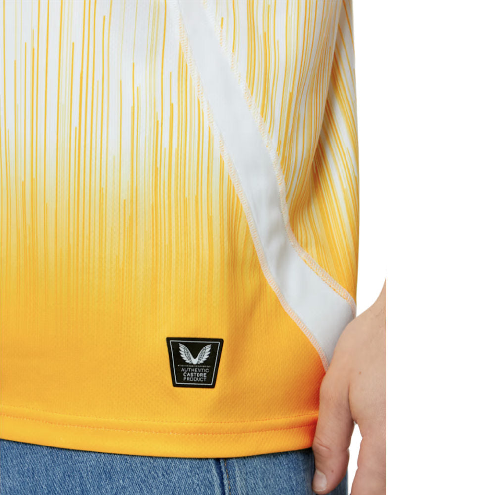 This eye-catching away shirt showcases a striking white base with a magnificent yellow gradient fade across the lower half, creating a dramatic visual effect that's sure to turn heads both on the terraces and in the stands. The innovative design features subtle vertical line detailing that adds depth and texture to the overall aesthetic.