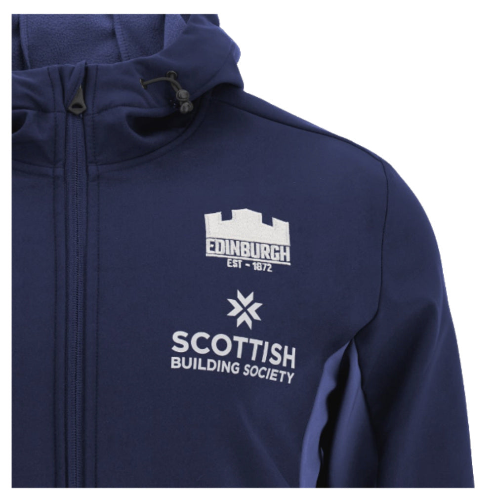 Edinburgh Rugby 2024-25 softshell jacket. Navy heavyweight softshell jacket with zipped pockets and club crest applied over the heart.
