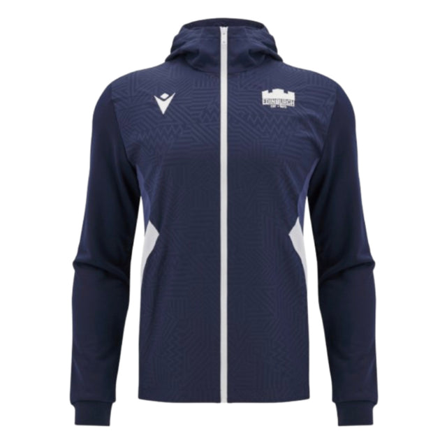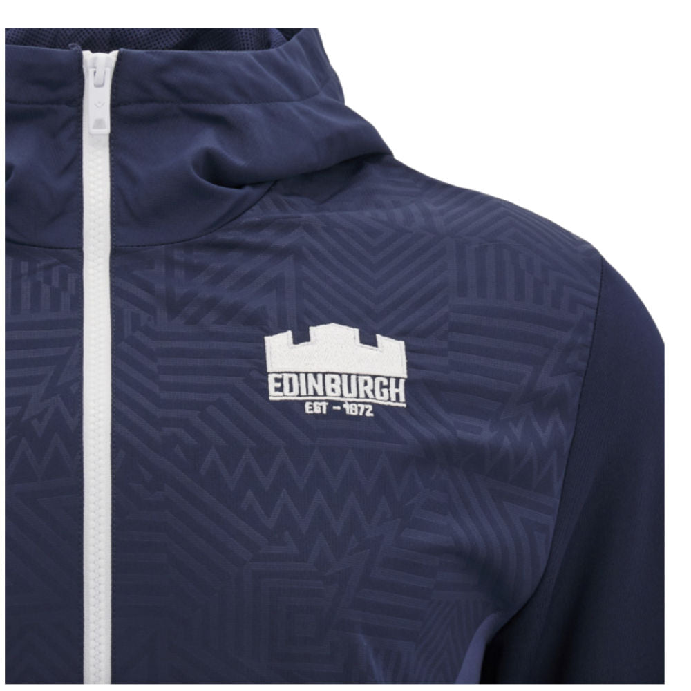 Edinburgh Rugby 2024-2025 warm up anthem jacket. Navy full zip hooded warm up jacket with tone on tone pattern over the torso and white details at the flanks.