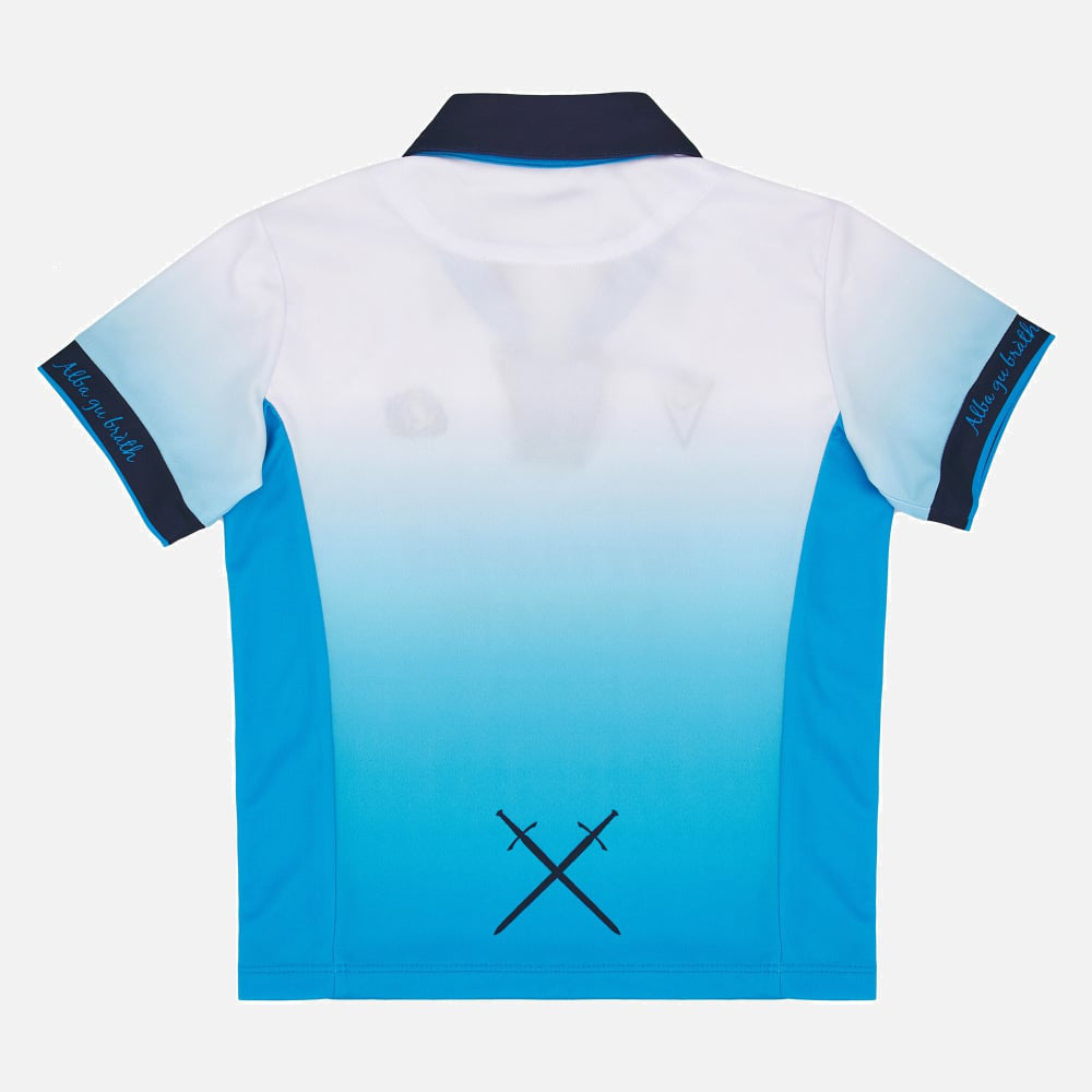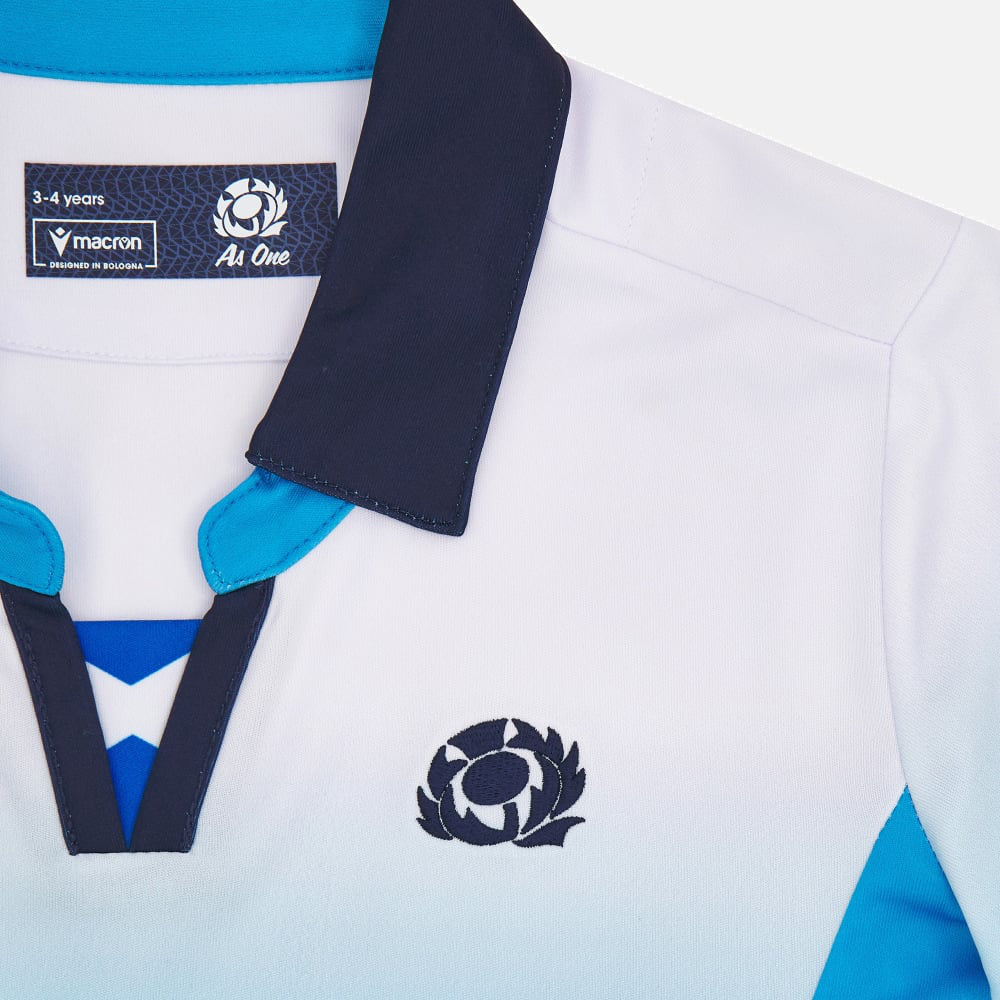 2024/25 kids away replica shirt - white and blue kids shirt with navy collar, and cuffs sublimated with 'alba gu brth'; the Scotland crest is embroidered over the heart in navy and claymores are sublimated on the rear.