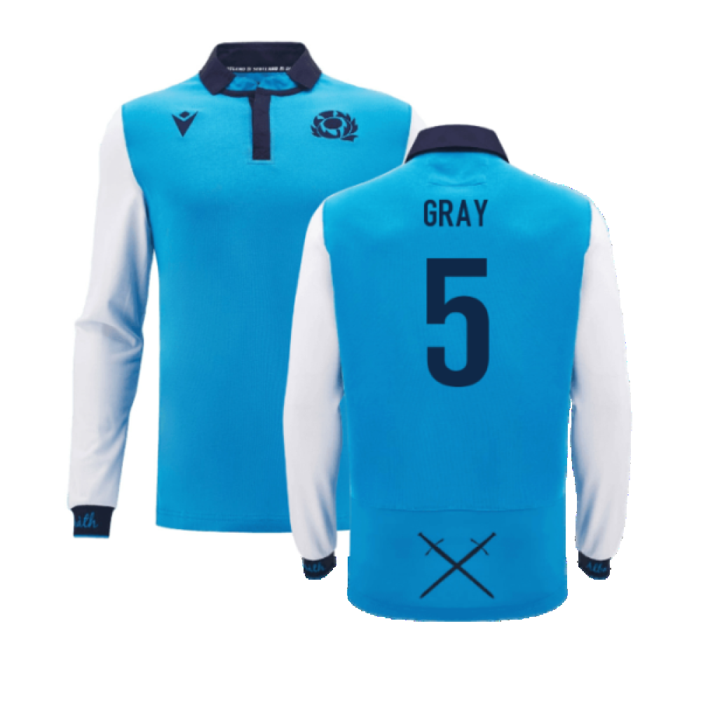 Official Jonny Gray football shirt. This is the NEW Scotland Rugby Away LS Cotton Shirt for the 2024-2025 season which is manufactured by Macron and is available in all (Adult/Childrens) sizes.