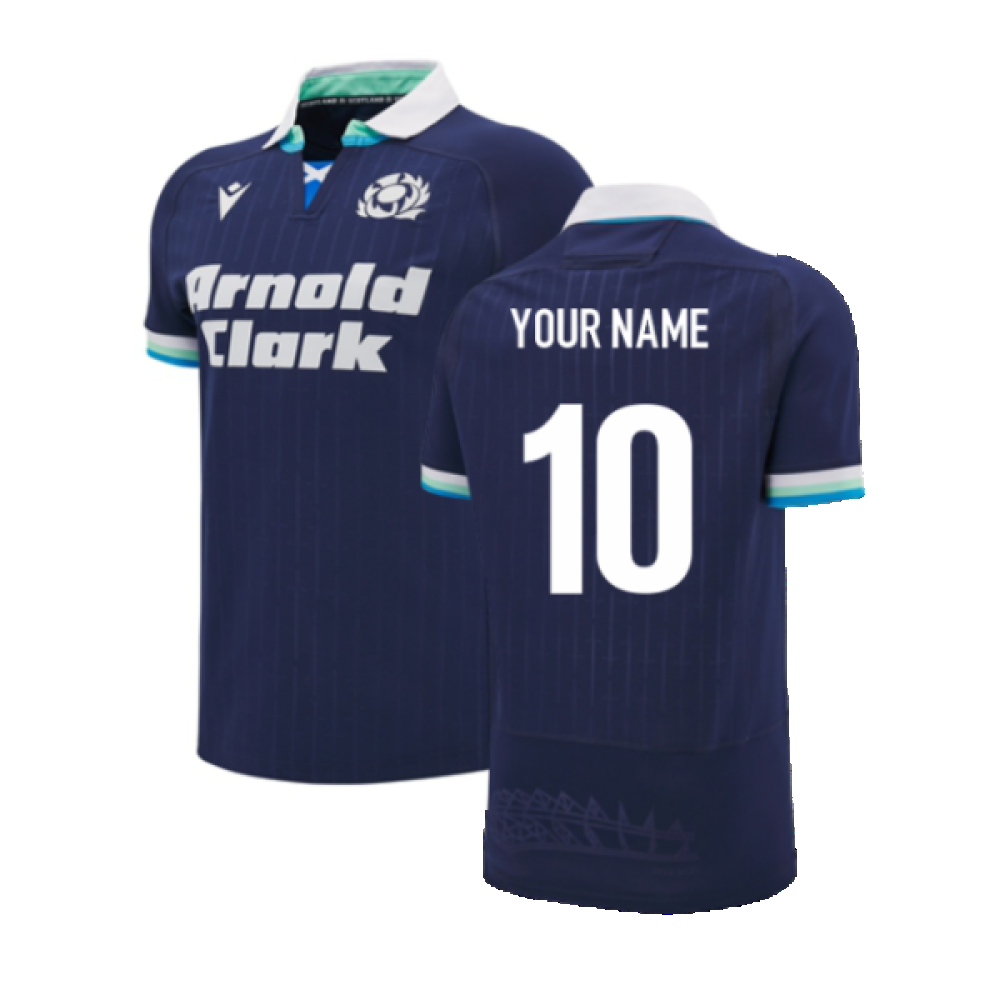 Official Your Name football shirt. This is the NEW Scotland Rugby Home Slim Fit Shirt for the 2024-2025 season which is manufactured by Macron and is available in all Adult sizes.