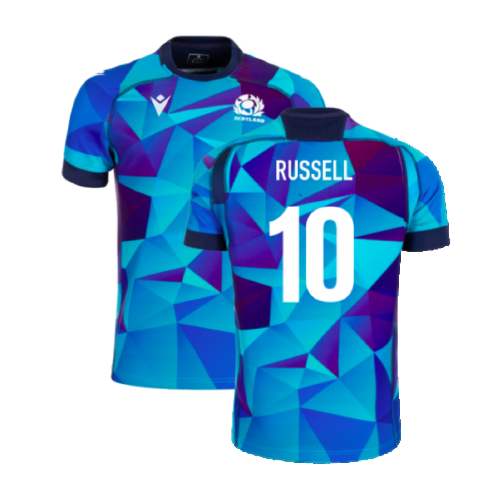Official Finn Russell football shirt. This is the NEW Scotland Rugby Training Jersey (Blue) - Kids for the 2024-2025 season which is manufactured by Macron and is available in all Childrens sizes.
