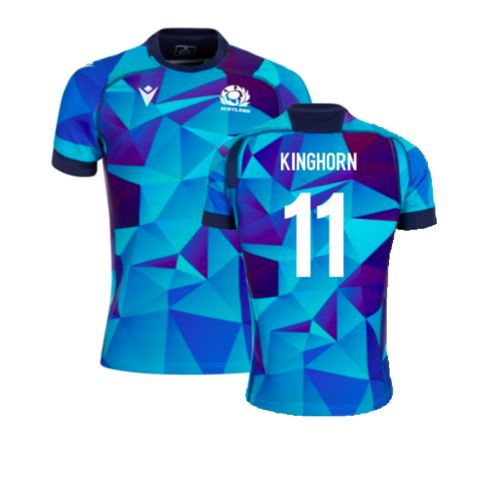 Official Blair Kinghorn football shirt. This is the NEW Scotland Rugby Training Jersey (Blue) for the 2024-2025 season which is manufactured by Macron and is available in all Adult sizes.