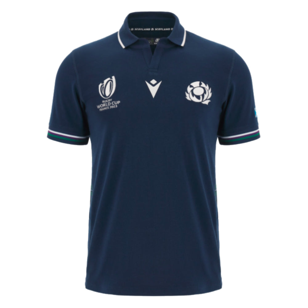 The short-sleeved navy rugby shirt is made from cotton for durability and comfort while supporting the team. The upper chest of the shirt proudly shows off the embroidered Scottish Rugby logo over the heart alongside the Rugby World Cup and Macron logos on the upper chest. The Scotland flag is also featured on the sleeve of the shirt.