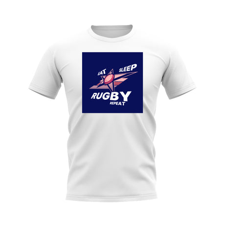 Eat, Sleep, Rugby Repeat T-Shirt - Version 10 (White/Blue)