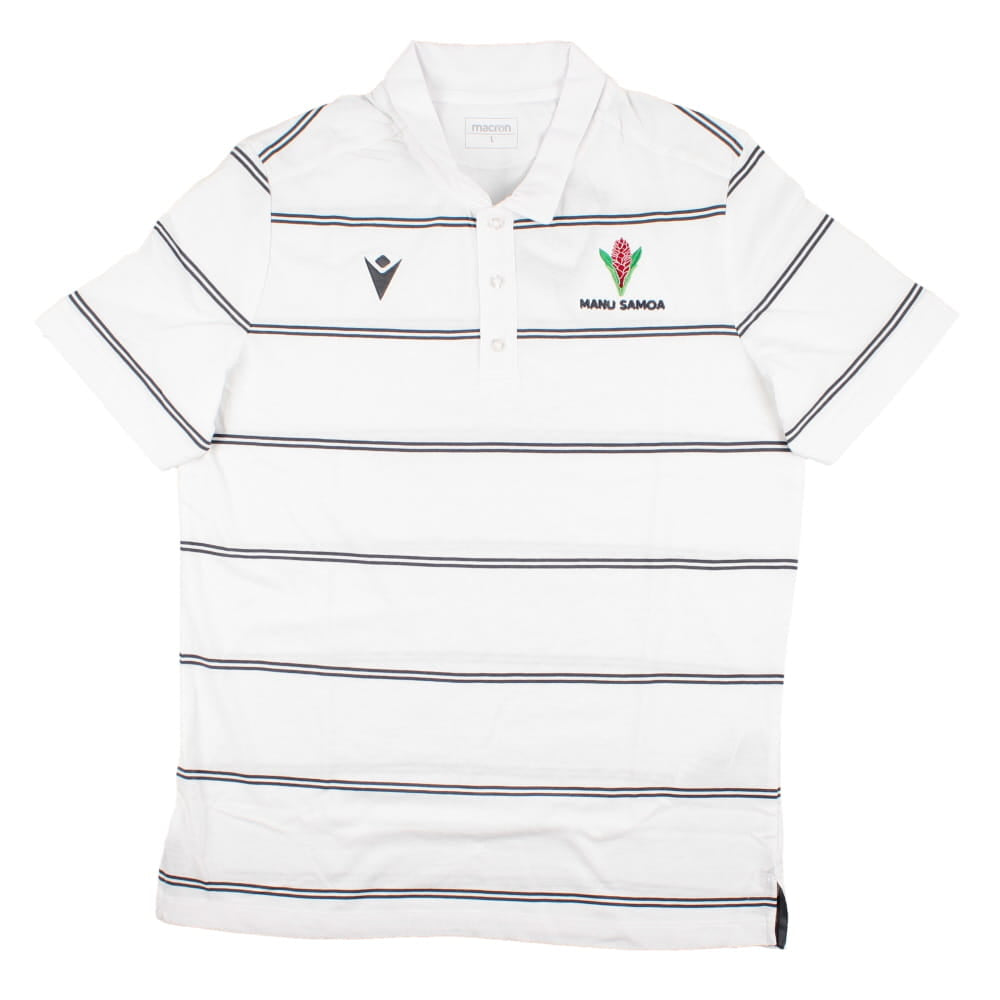 The Samoa 2023-2024 Travel Player Cotton Polo Rugby Shirt in White is a stylish and comfortable garment designed for rugby enthusiasts and fans alike. Inspired by the rich rugby culture of Samoa, this polo shirt combines sporty aesthetics with premium cotton fabric to provide a great wearing experience.