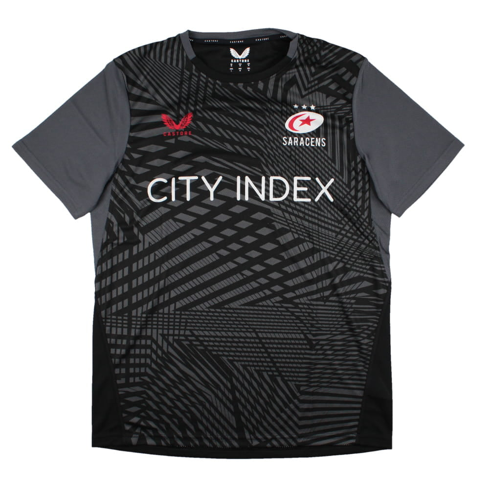The Saracens 2023-2024 Short Sleeve Rugby Training Tee is a functional and performance-oriented piece of sports apparel designed for players of Saracens Rugby Football Club. This training tee is part of the official merchandise collection for the 2023-2024 rugby season and serves as a staple item for players during training sessions and workouts.