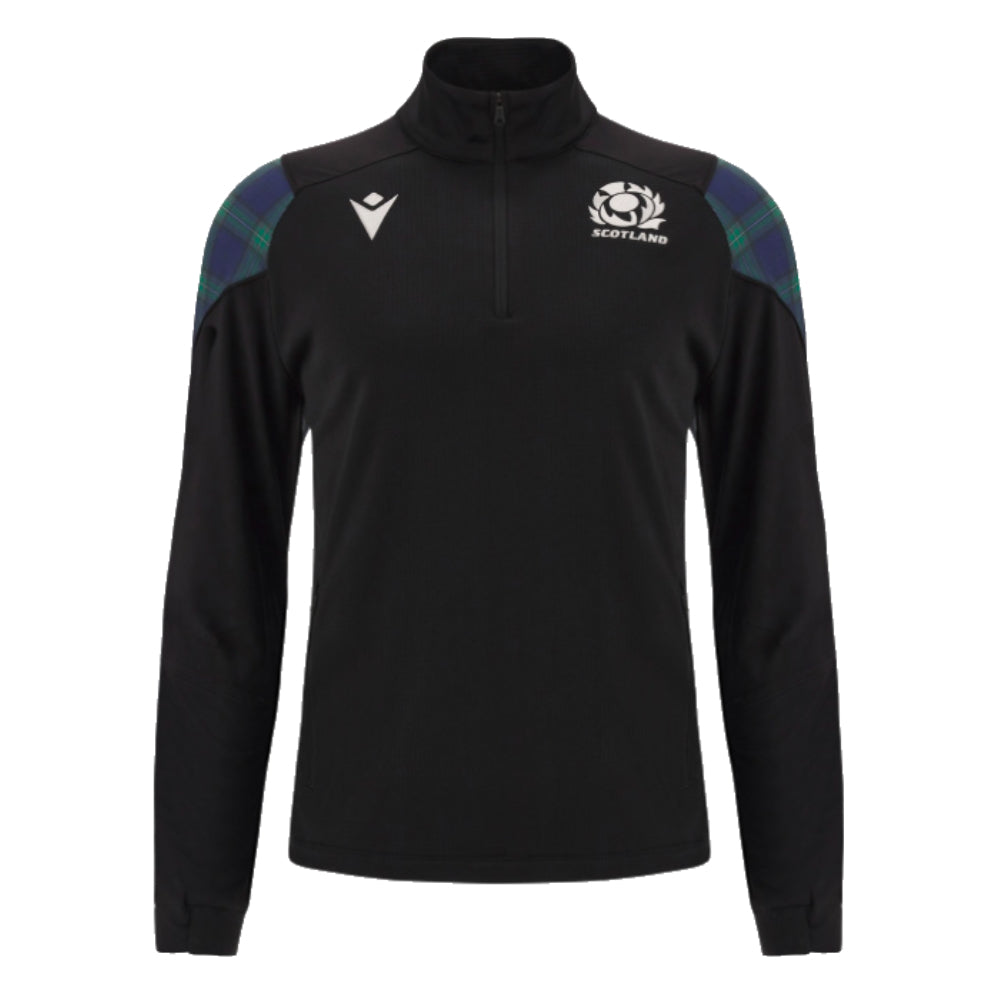 This is the 2023-2024 Black 1/4 zip fleece with tartan panels on the shoulder, toggled waistband and embroidered Scotland Rugby crest.