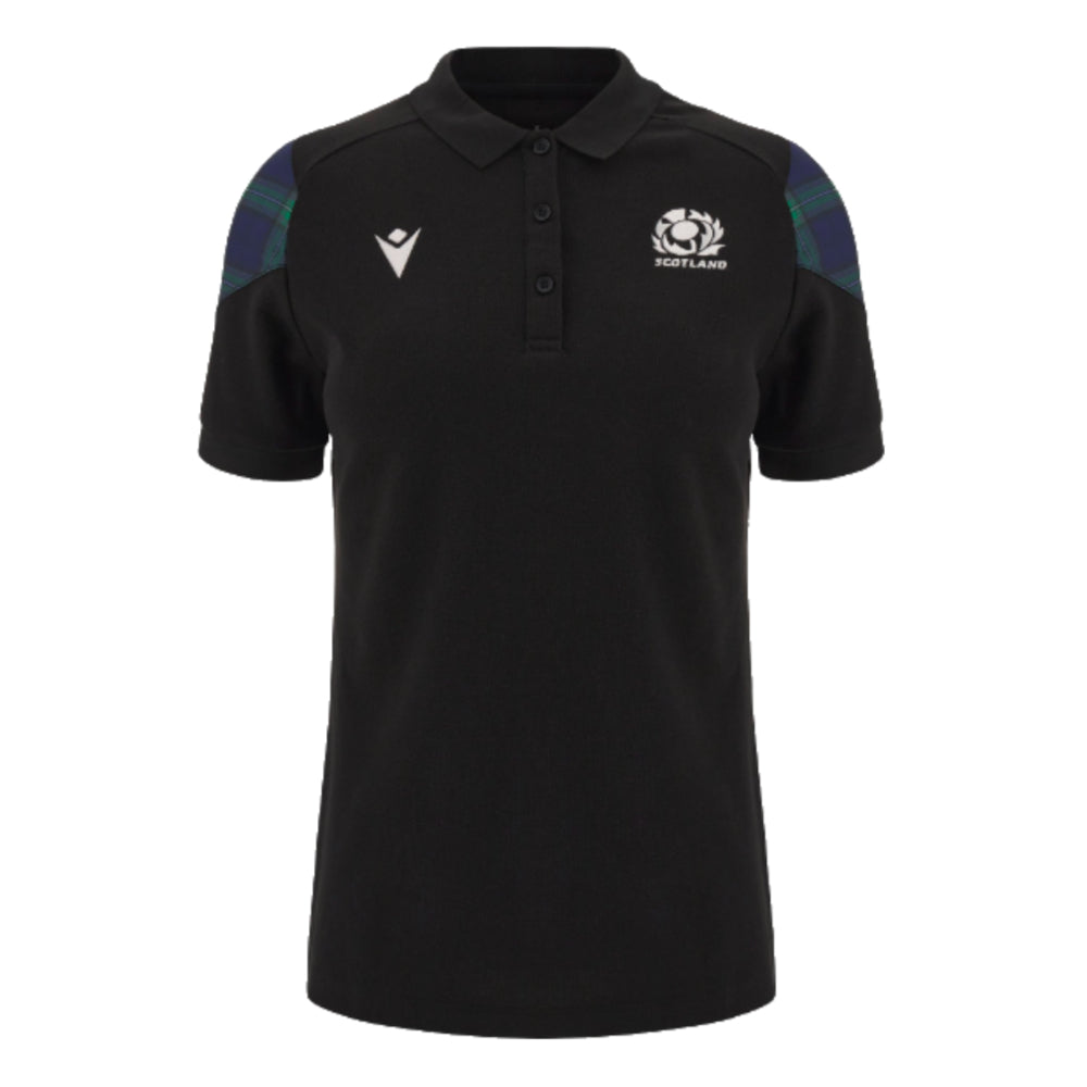 The Scotland Rugby 2023-2024 womens piquet polo. Black womens fit cotton polo with tartan panels on the shoulders and embroidered Scotland Rugby crest.
