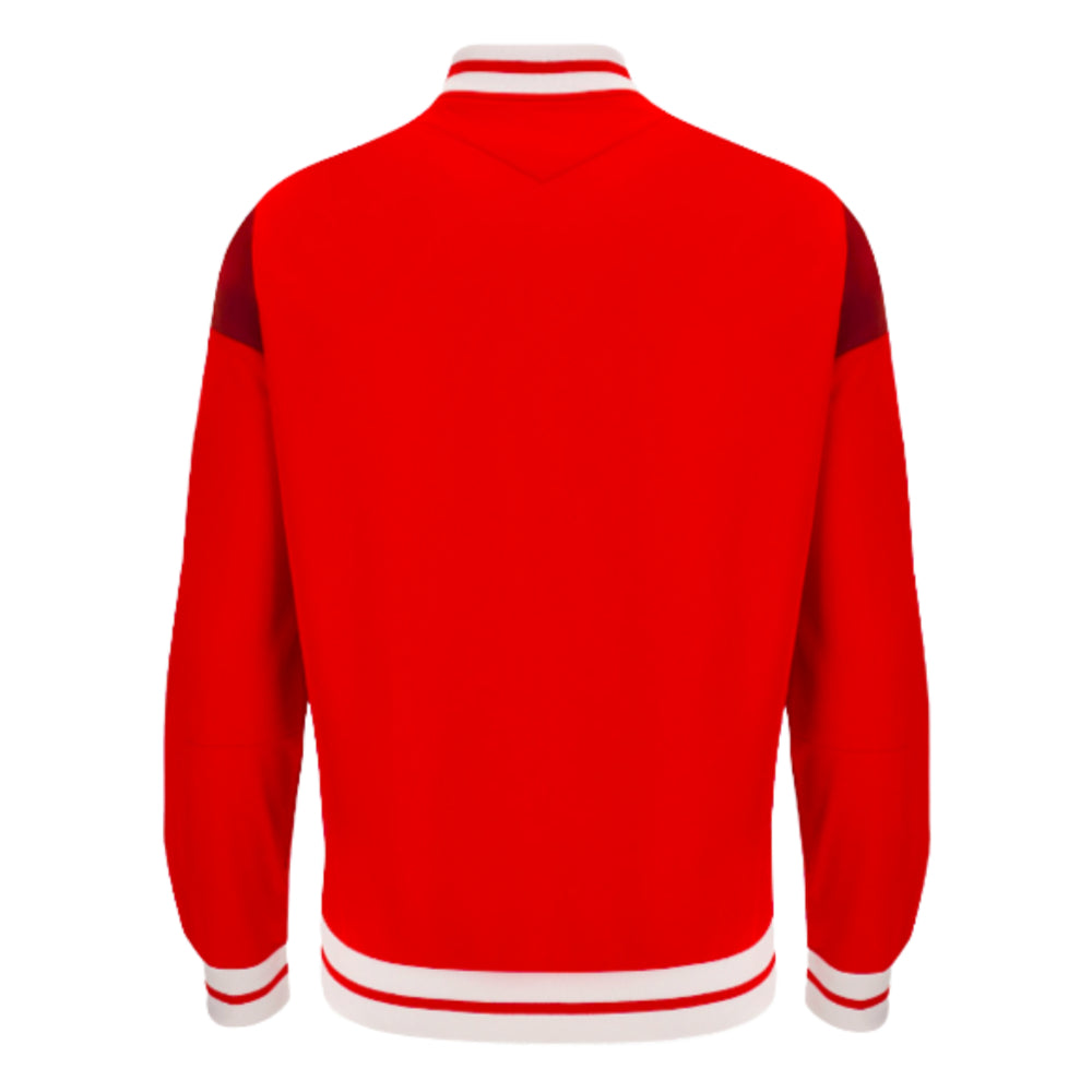 The Welsh Rugby 2023-2024 anthem jacket comes in a two tone red, varsity style, anthem jackets with red and white pinstripe accents, zipped pockets and elasticated cuffs.