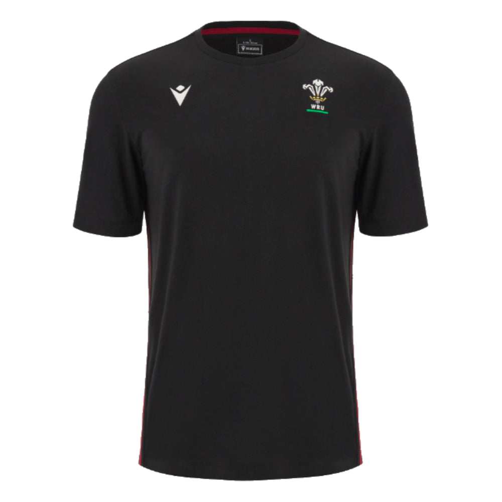 The Wales 2023-2024 Rugby Travel Cotton Shirt in black with black and red taping down the flanks and embroidered Welsh Rugby crest.