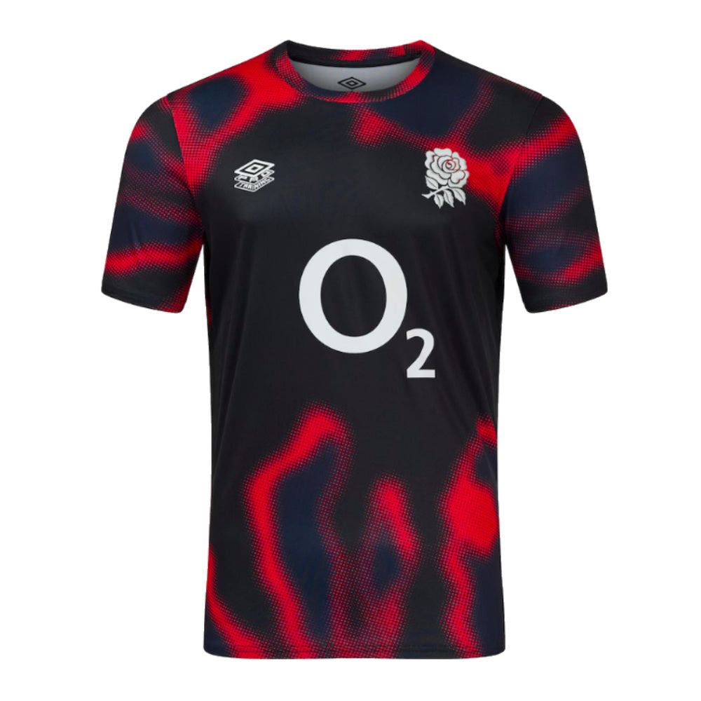 The England 2024-2025 Rugby Warm-Up Jersey is designed for high-performance and comfort, making it ideal for pre-match routines. Featuring the iconic O2 sponsor logo prominently on the front, this jersey combines style and functionality. The lightweight, breathable fabric helps regulate body temperature, while the ergonomic fit allows for ease of movement. The England Rugby crest is proudly displayed on the chest, adding a touch of national pride, and the bold design elements showcase the team's colors. Perfect for both athletes and fa