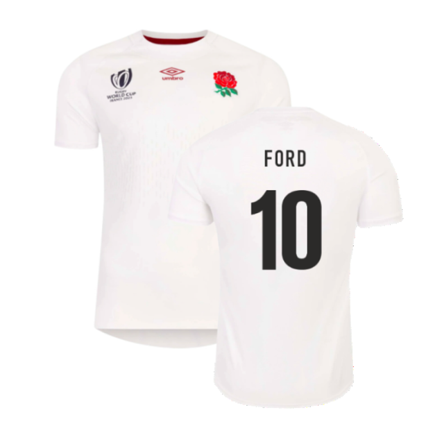 Official George Ford football shirt. This is the NEW England RWC 2023 Home Rugby Jersey (Kids) which is manufactured by Umbro and is available in all Childrens sizes.