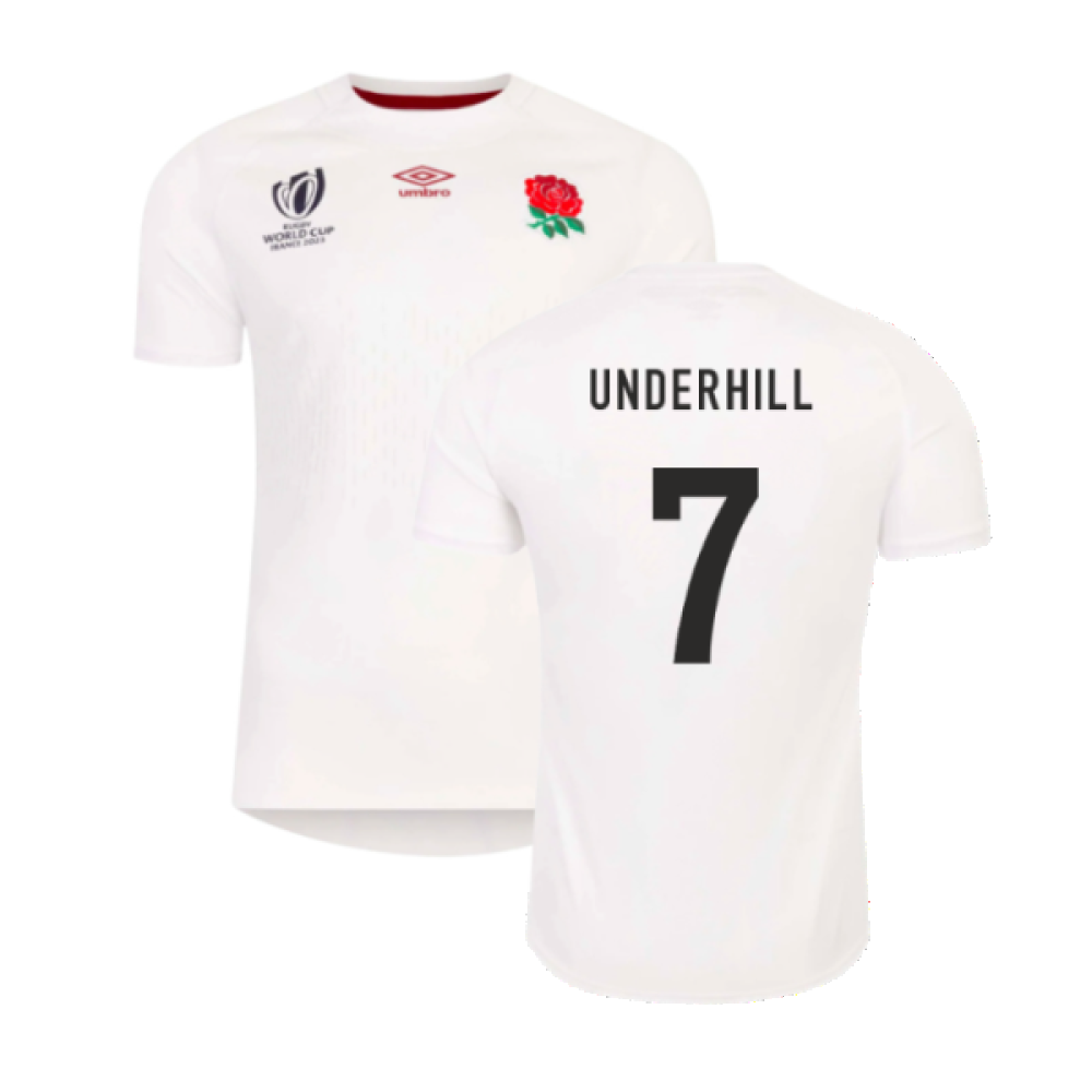 Official Sam Underhill football shirt. This is the NEW England RWC 2023 Home Rugby Jersey (Kids) which is manufactured by Umbro and is available in all Childrens sizes.