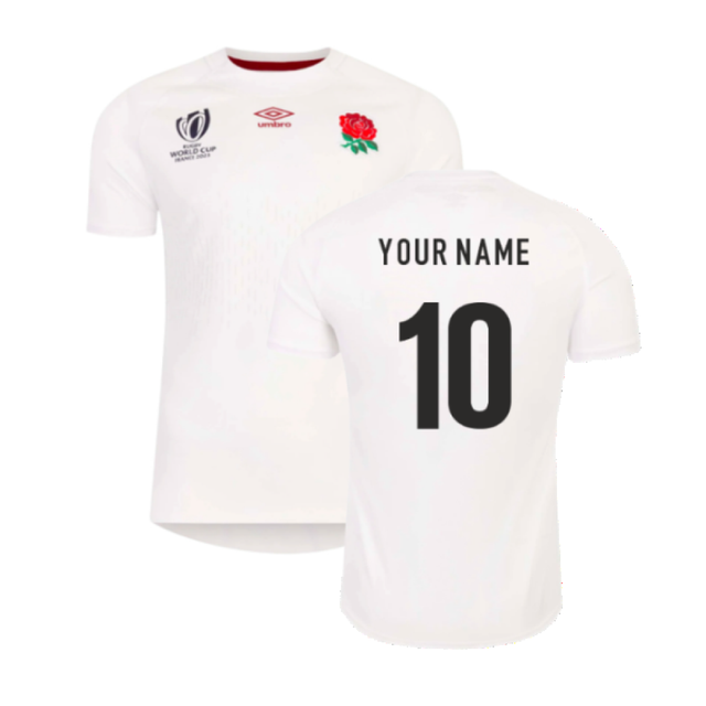 Official Your Name football shirt. This is the NEW England RWC 2023 Home Rugby Jersey (Kids) which is manufactured by Umbro and is available in all Childrens sizes.